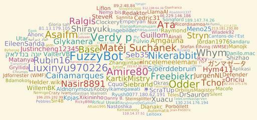 | Keywords: Word cloud of Tech News translators.svg tech newsletter as of 2014-07-30 Source data Generated by Tomasz W Kozlowski see below User names are weighted by a function of their number of edits Due to the wide difference in edit counts some names would be huge and others invisible if we used the raw weighting In order to be able to read most names we use edit counts' natural logarithm and add 0 5 so users with only one edit still appear Word cloud generated using http //www wordle net/ Wordle's http //www wordle net/advanced advanced generator by Jonathan Feinberg Due to Wordle's Print function the text was converted to paths and is thus uneditable Color palette http //ethanschoonover com/solarized Solarized by Ethan Schoonover Font Lucida Sans own Guillaume Paumier 2014-07-30 Source data wikitable sortable User Edit count as of 2014-07-30 ln edit count + 0 5 Color hexadecimal - FuzzyBot 3455 8 65 268bd2 - Verdy p 1511 7 82 2aa198 - Odder 936 7 34 859900 - Liuxinyu970226 910 7 31 6c71c4 - Amire80 829 7 22 d33682 - Ата 745 7 11 dc322f - Matěj Suchánek 724 7 08 cb4b16 - Asaifm 693 7 04 b58900 - Whym 686 7 03 657b83 - Nikerabbit 638 6 96 268bd2 - Freebiekr 474 6 66 2aa198 - Base 417 6 53 859900 - Rubin16 406 6 51 6c71c4 - Ralgis 381 6 44 d33682 - Nasir8891 346 6 35 dc322f - Tchoř 295 6 19 cb4b16 - Stryn 250 6 02 b58900 - Shirayuki 242 5 99 657b83 - Cainamarques 212 5 86 268bd2 - Glykanera 174 5 66 2aa198 - KartikMistry 135 5 41 859900 - Seb35 133 5 39 6c71c4 - Guillom 120 5 29 d33682 - Hym411 117 5 26 dc322f - ガンマゼータ 111 5 21 cb4b16 - Amgauna 100 5 11 b58900 - Xuacu 99 5 10 657b83 - Sjoerddebruin 94 5 04 268bd2 - יונה בנד אק 85 4 94 2aa198 - Siebrand 76 4 83 859900 - EileenSanda 71 4 76 6c71c4 - Justincheng12345 71 4 76 d33682 - Oriciu 68 4 72 dc322f - JurgenNL 66 4 69 cb4b16 - İncelemeelemani 62 4 63 b58900 - DrSauron 61 4 61 657b83 - Meno25 57 4 54 268bd2 - ValterVB 52 4 45 2aa198 - WillemBK 50 4 41 859900 - ScraTUp 48 4 37 6c71c4 - Matanya 46 4 33 d33682 - SteveR 44 4 28 dc322f - Cedric31 43 4 26 cb4b16 - Helder wiki 43 4 26 b58900 - Shizhao 42 4 24 657b83 - Kpjas 40 4 19 268bd2 - Utar 40 4 19 2aa198 - Jordan1976 38 4 14 859900 - Cquoi 37 4 11 6c71c4 - Rxy 36 4 08 d33682 - Redaktor 34 4 03 dc322f - Defender 33 4 00 cb4b16 - Dianakc 33 4 00 b58900 - Clockery 32 3 97 657b83 - Aldnonymous 31 3 93 268bd2 - Fúlvio 31 3 93 2aa198 - Raymond 31 3 93 859900 - Ahonc 29 3 87 6c71c4 - Xikininho 29 3 87 d33682 - Liflon 28 3 83 dc322f - LlamaAl 28 3 83 cb4b16 - Manojk 28 3 83 b58900 - Okras 28 3 83 657b83 - Ungebildet 28 3 83 268bd2 - Danilo mac 27 3 80 2aa198 - Zhangjintao 26 3 76 859900 - Emperyan 25 3 72 6c71c4 - Gryllida 25 3 72 d33682 - Ainali 23 3 64 dc322f - Jdforrester WMF 22 3 59 cb4b16 - OrbiliusMagister 22 3 59 b58900 - Robby 22 3 59 657b83 - Ikamegawati 21 3 54 268bd2 - Sandaru 21 3 54 2aa198 - Macofe 20 3 50 859900 - Nastoshka 20 3 50 6c71c4 - Nemo bis 20 3 50 d33682 - Nux 20 3 50 dc322f - Porbóllett 20 3 50 cb4b16 - Sir48 20 3 50 b58900 - Aplikasi 19 3 44 657b83 - Ryush00 19 3 44 268bd2 - Songford 19 3 44 2aa198 - Bdamokos 18 3 39 859900 - 77 180 62 191 17 3 33 6c71c4 - Wladek92 17 3 33 d33682 - Ricordisamoa 16 3 27 dc322f - Sannita 16 3 27 cb4b16 - Teles 16 3 27 b58900 - عباد ديرانية 16 3 27 657b83 - Cantons-de-l'Est 15 3 21 268bd2 - Rifkul Uswati 15 3 21 2aa198 - Silent 15 3 21 859900 - 81 13 179 105 14 3 14 6c71c4 - Danny B 14 3 14 d33682 - Stefan Elfving WMSE 14 3 14 dc322f - Steinsplitter 14 3 14 cb4b16 - Automatik 13 3 06 b58900 - Gloria sah 13 3 06 657b83 - Leitoxx 13 3 06 268bd2 - 189 147 74 26 12 2 98 2aa198 - Jytim 12 2 98 859900 - 콩 루 11 2 90 6c71c4 - 46 229 146 186 11 2 90 d33682 - 89 2 48 84 11 2 90 dc322f - Crazy Ivan 11 2 90 cb4b16 - -jem- 11 2 90 b58900 - Sebastian Wallroth 11 2 90 657b83 - 130 234 176 194 10 2 80 268bd2 - ElangoRamanujam 10 2 80 2aa198 - Nemigo 10 2 80 859900 - Pebbles 10 2 80 6c71c4 - RickyB98 9 2 70 d33682 - ערן 9 2 70 dc322f - 림 8 2 58 cb4b16 - Aftab1995 8 2 58 b58900 - Akifumii 8 2 58 657b83 - ArséniureDeGallium 8 2 58 268bd2 - Epok 8 2 58 2aa198 - Kertwonesty 8 2 58 859900 - Rzuwig 8 2 58 6c71c4 - 110 14 37 51 7 2 45 d33682 - 196 205 192 99 7 2 45 dc322f - 213 181 230 80 7 2 45 cb4b16 - Byfserag 7 2 45 b58900 - Chrumps 7 2 45 657b83 - PiRSquared17 7 2 45 268bd2 - TeleComNasSprVen 7 2 45 2aa198 - Tracerneo 7 2 45 859900 - Abaddon1337 6 2 29 6c71c4 - Galaxen 6 2 29 d33682 - Gianfranco 6 2 29 dc322f - Jean-Frédéric 6 2 29 cb4b16 - Lucifer8k 6 2 29 b58900 - Lucioas 6 2 29 657b83 - Myr 6 2 29 268bd2 - RLuts 6 2 29 2aa198 - Sreejithk2000 6 2 29 859900 - TianyinLee 6 2 29 6c71c4 - 112 198 64 34 5 2 11 d33682 - 222 67 30 201 5 2 11 dc322f - 82 201 175 176 5 2 11 cb4b16 - Fabsouza1 5 2 11 b58900 - Geraki 5 2 11 657b83 - Ypnypn 5 2 11 268bd2 - 82 239 8 180 4 1 89 2aa198 - 91 117 4 220 4 1 89 859900 - Joan manel 4 1 89 6c71c4 - Linnea 4 1 89 d33682 - Ramakrishnan nikhil 4 1 89 dc322f - Sergento 4 1 89 cb4b16 - Shangkuanlc 4 1 89 b58900 - Tuankiet65 4 1 89 657b83 - קובי כרמ 4 1 89 268bd2 - 111 161 97 254 3 1 60 2aa198 - 151 67 117 52 3 1 60 859900 - 177 148 217 222 3 1 60 6c71c4 - 190 100 56 220 3 1 60 d33682 - 5 54 40 131 3 1 60 dc322f - Amgr 88 3 1 60 cb4b16 - Cekli829 3 1 60 b58900 - Chelin 3 1 60 657b83 - Dobosattilasandor 3 1 60 268bd2 - Lvova 3 1 60 2aa198 - V narsikar 3 1 60 859900 - Vogone 3 1 60 6c71c4 - Xcodexif 3 1 60 d33682 - Zetud 3 1 60 dc322f - Zwiadowca21 3 1 60 cb4b16 - 201 29 180 215 2 1 19 b58900 - 91 196 53 134 2 1 19 657b83 - Abelpadilla 2 1 19 268bd2 - Bjankuloski06 2 1 19 2aa198 - Cwek 2 1 19 859900 - Dzięcioł 3 2 1 19 6c71c4 - Epescopo 2 1 19 d33682 - Liangent 2 1 19 dc322f - Nuriaballtor 2 1 19 cb4b16 - Putnik 2 1 19 b58900 - Takot 2 1 19 657b83 - UsmanPathanKhan 2 1 19 268bd2 - Uziel302 2 1 19 2aa198 - Zerabat 2 1 19 859900 - Zhaofeng Li 2 1 19 6c71c4 - 114 130 28 26 1 0 50 d33682 - 114 187 115 58 1 0 50 dc322f - 176 11 53 141 1 0 50 cb4b16 - 178 2 17 122 1 0 50 b589