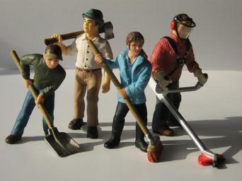 Keywords: workers figures dolls toys hauling scoop broom return sweep axe forest workers lumberjack mow cut grass gardening lawn mower