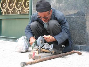 Keywords: working old man glasses sharp knife looking