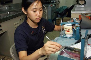 | Keywords: Working on dentures DVIDS109480.jpg en University of California at San Diego student Thien-Kim Le from San Diego Calif representing the UCSD Pre-Dental Society uses wax for tooth placement on a set of dentures for a patient while aboard the Military Sealift Command hospital ship USNS Mercy during Pacific Partnership 2008 Mercy is the primary platform for Pacific Partnership a four-month humanitarian mission providing engineering civic medical and dental assistance to Southeast Asia and Oceania 2008-08-16 https //www dvidshub net/image/109480 080816-N-+++++-025 2008-08-19 04 27 PORT MORESBY PG PD-USGov-Military-Navy USNS Mercy T-AH-19 Pacific Partnership 2008 Images from DoD uploaded by Fæ |