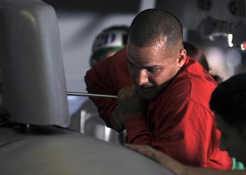 | Keywords: Working on the fuel tank DVIDS105215.jpg en Petty Officer 1st Class Hiran Carrero loosens a nut holding one of the fuel tanks of an F/A-18F Super Hornet assigned to the Blacklions of Strike Fighter Squadron 213 in the hangar bay of the Nimitz-class aircraft carrier USS Theodore Roosevelt The Theodore Roosevelt Carrier Strike Group is currently participating in Joint Task Force Exercise Operation Brimstone off the Atlantic coast 2008-07-22 Petty Officer 2nd Class Nathan Laird https //www dvidshub net/image/105215 080722-N-+++++-001 2008-07-24 10 01 USNORTHCOM AT SEA PD-USGov-Military-Navy F/A-18F Super Hornet USS Theodore Roosevelt CVN-71 Images from DoD uploaded by Fæ Photographs by Nathan Laird |