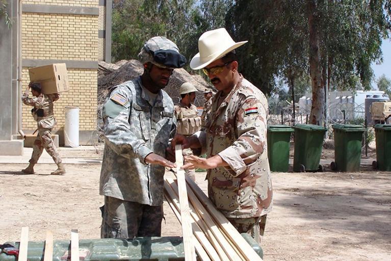 | Keywords: Working together DVIDS20940.jpg en CAMP TAJI Iraq -- Although Sgt Ernest Sanders team leader Company B 62nd Engineer Battalion 16th Engineer Brigade Multi-National Division -- Baghdad and Warrant Officer Kassim Muhammed carpenter 9th Iraqi Army Division don't share a common language the two said it didn't hinder their ability to communicate while working together to construct a tactical operations center for the 9th IAD here The two-week partnership which began April 16 was the first combined construction mission undertaken by the 62d Eng Bn Soldiers and 9th IAD engineers Sanders of Fairbanks Alaska and Muhammed ensure the quality and dimension of trim edging meets the specifications required for the project U S Army photo by Sgt 1st Class Tracy Ballog 16th Eng Bde PAO 2006-05-22 https //www dvidshub net/image/20940 20940 2006-05-22 12 28 TAJI IQ PD-USGov Camp Taji Images from DoD uploaded by Fæ 62nd Engineer Battalion United States |