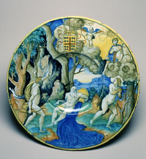 Keywords: Workshop of Guido Durantino - Plate with Apollo and Daphne - Walters 481368.jpg This plate belongs to a large set of tableware commissioned by Duke Anne de Montmorency 1493-1567 from the Durantino workshop in 1535 The subject is taken from The Metamorphoses by the 1st-century Roman poet Ovid Cupid god of erotic love tricks the god Apollo into falling in love with Daphne daughter of the river-god Peneus Apollo chases the frightened nymph until when he is about to catch her she comes to the river of her father depicted here and prays to him to save her He changes her into a laurel tree and the devastated Apollo makes a vow forever to venerate the tree that was once Daphne The nymph was a traditional symbol of virtue 1535 Renaissance earthenware with tin glaze maiolica cm 3 4 24 7 accession number 48 1368 20880 Baron Seillière date and mode of acquisition unknown Clarke date and mode of acquisition unknown no 609 Henry Walters Baltimore 1916 mode of acquisition unknown Walters Art Museum Henry Walters Acquired by Henry Walters 1916 Apollo Seguita/Daphne qual se/ converh in Luaro+/ The Taste of Maryland Art Collecting in Maryland 1800-1934 The Walters Art Gallery Baltimore 1984 Le dressoir du prince services d'apparat à la Renaissance Musée national de la Renaissance Ecouen 1995-1996 place of origin Urbino Italy Walters Art Museum license Italian Renaissance maiolica in the Walters Art Museum Guido Durantino Apollo and Daphne Media contributed by the Walters Art Museum needs category review