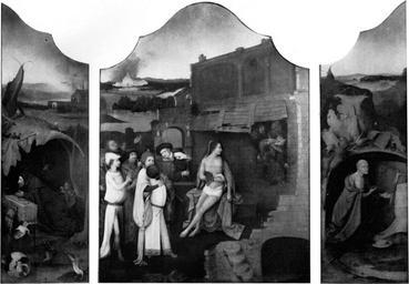 | Keywords: Workshop of Jheronimus Bosch 003 interior.jpg workshop of i18n/or follower of Title Job Triptych Job-triptiek Alternate titles LangSwitch The Story of Job <ref>Koldeweij Vandenbroeck and Vermet 2001; ISBN 0-8109-6735-9 p 88 </ref> De bevroeving van Job - De bekoring van de H Antonius - De penitentie van de H Hiëronymus <ref>De Tolnay 1986; ISBN 9061131642 p 567 </ref> ~ 1507-1515 oil oak panel cm 98 3 132 8 Institution Groeningemuseum Object history by 1858 St-Jacob-de-Meerdere-kerk Hoeke ProvenanceEvent 1931 loan LangSwitch das the au het Groeningemuseum Brugge St-Jacob-de-Meerdere-kerk Hoeke Max J Friedländer 1969 Early Netherlandisch Painting Volume V Geertgen tot Sint Jans and Jerome Bosch Leyden A W Slijthof Brussels La Connaissance cat no Add 136 plate 118 top 0 209 Other versions Workshop of Jheronimus Bosch 003 exterior jpg Exterior Exhibition history black and white image 59 Drieluik met Job Antonius en Hiëronymus Size cm 98 3 72 1 LangSwitch central panel middenpaneel cm 98 1 30 5 and cm 97 8 30 2 LangSwitch wings zijluiken inv 209 Anonymous 56794 name Workshop of LangSwitch Hieronymus Jheronimus Bosch / LangSwitch Hieronymus Jheronimus Bosch De H Antonius links ; De beproevingen van Job midden ; De H Hieronymus rechts ~ 1507 LangSwitch or later of later 1505-1515 cm 98 3 72 1 LangSwitch central panel middenpaneel cm 98 1 30 5 LangSwitch right wing rechterluik cm 97 8 30 2 LangSwitch left wing linkerluik inv 0 209 Anonymous 92786 Follower of LangSwitch Hieronymus Jheronimus Bosch Job-triptiek ~ 1507 1526- ~ 1600 cm 98 3 132 8 cm 98 3 72 1 LangSwitch central panel middenpaneel cm 98 1 30 5 LangSwitch left wing linkerluik cm 97 8 30 2 LangSwitch right wing rechterluik ˜In a very poor state of preservation almost entirely overpainted ™ Workshop of LangSwitch Hieronymus Jheronimus Bosch / LangSwitch Hieronymus Jheronimus Bosch Job getroost door de muzikanten geopend Antonius Job getroost door de muzikanten Hieronymus ~ 1507 LangSwitch or later of later cm 98 3 132 5 color image PD-old-100 LangSwitch References Noten <references /> ImageNote 1 662 497 376 515 1634 1134 2 299px ImageNoteEnd 1 ImageNote 2 1283 597 300 394 1634 1134 2 299px<br /> File Workshop of Jheronimus Bosch 003 right inner wing 02 detail 01 jpg ImageNoteEnd 2 Job Triptych workshop of Hieronymus Bosch 01 Paintings after Hieronymus Bosch Jerome01 |