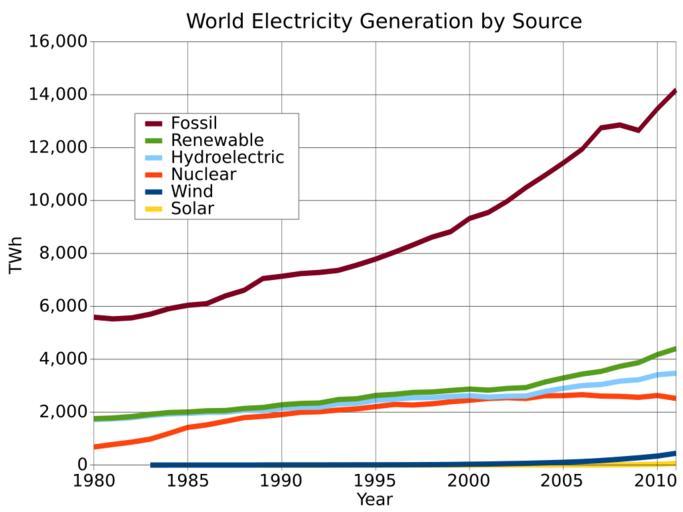 | Keywords: World Electricity Generation by Source.svg en World electricity generation Fossil fuels vs nuclear and renewable energy Also shown is generation from hydroelectricity wind and solar Data from U S DOE EIA http //www eia gov/cfapps/ipdbproject/IEDIndex3 cfm tid 2 pid 2 aid 12 2014-06-11 own Delphi234 cc-zero Uploaded with UploadWizard Electricity production trends Energy use comparisons | ||||