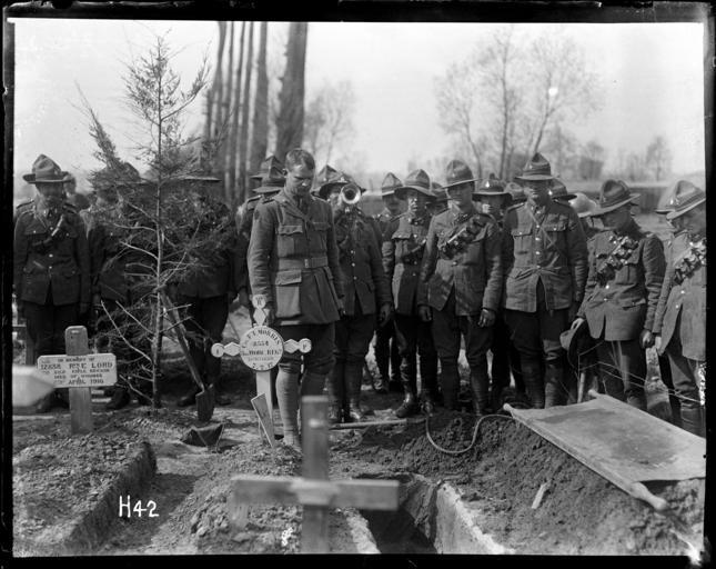 | Keywords: blackandwhite monochrome photo border outdoor black and white World War I soldiers at the burial of Sapper J F Haynes of New Zealand Engineers, at or near Romarin, France, circa 6 May 1917. Shows men around the grave which is alongside that of Cpl F T Morris. One of the men plays (the Last Post?) on a bugle. Photograph taken 1917 by Henry Armytage Sanders. Inscriptions: Inscribed - Photographer's title on negative -bottom left: H42. Quantity: 1 b&w original negative(s). Physical Description: Dry plate glass negative 4 x 5 inches New Zealand. Army. NZEF. New Zealand Engineers. World War I New Zealand soldiers at the burial of Sapper J F Haynes, Romarin, France. Royal New Zealand Returned and Services' Association :New Zealand official negatives, World War 1914-1918. Ref: 1/2-012759-G. Alexander Turnbull Library, Wellington, New Zealand. natlib.govt.nz/records/22769260 World War I soldiers at the burial of Sapper J F Haynes of New Zealand Engineers, at or near Romarin, France, circa 6 May 1917. Shows men around the grave which is alongside that of Cpl F T Morris. One of the men plays (the Last Post?) on a bugle. Photograph taken 1917 by Henry Armytage Sanders. Inscriptions: Inscribed - Photographer's title on negative -bottom left: H42. Quantity: 1 b&w original negative(s). Physical Description: Dry plate glass negative 4 x 5 inches New Zealand. Army. NZEF. New Zealand Engineers. World War I New Zealand soldiers at the burial of Sapper J F Haynes, Romarin, France. Royal New Zealand Returned and Services' Association :New Zealand official negatives, World War 1914-1918. Ref: 1/2-012759-G. Alexander Turnbull Library, Wellington, New Zealand. natlib.govt.nz/records/22769260 |