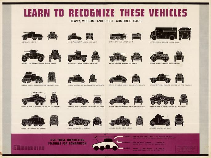 Keywords: World War II armoured cars.jpg en Chart features black white silhouette drawings of front and profile views of heavy medium and light armored cars Included are American British Russian German Italian and Japanese armored cars A purple band at the bottom includes tips for identification Prepared by G-3 Headquarter Armored Force Distributed by Army Orientation Course Special Service Division Services of Supply Navy distribution by War Education Program BuPers Navy Dept 1943 http //digital library unt edu/ark /67531/metadc506/ q 22United 20States 20Army 20Services 20of 20Supply 20Special 20Service 20Division 22 United States Army Services of Supply Special Service Division PD-USGov other versions PD-USGov-Military-Army Armoured cars of World War II World War II posters from the United States Uploaded with UploadWizard |
