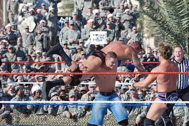 | Keywords: World Wrestling Entertainment wrestles way to Victory DVIDS134445.jpg en World Wrestling Entertainment Inc superstar John Cena slams Randy Orton during the WWE's Tribute to the Troops as Multi-National Division “ Baghdad and 4th Infantry Division Soldiers enjoy the show which was held in front of the Al Faw Palace on Camp Victory Dec 5 The event marks the sixth year in a row that WWE superstars have come to entertain U S troops stationed on the front lines in Iraq 2008-12-05 Staff Sgt Daleanne Maxwell https //www dvidshub net/image/134445 134445 2008-12-08 11 09 BAGHDAD IQ PD-USGov Camp Victory Al-Faw Palace Images from DoD uploaded by Fæ |