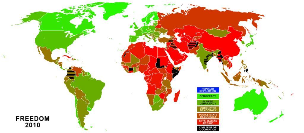 | Keywords: Worldfreedom2010.png en World Democracy 2010 own Ingoman 2011-02-09 Using the following data https //spreadsheets google com/pub key 0AloywFw9emCwdDFQeWhFQVNDSHhqV2dUaTktTDA0RHc hl en output html Google doc Democracy Political maps of the world 2010 maps PNG maps of the world |