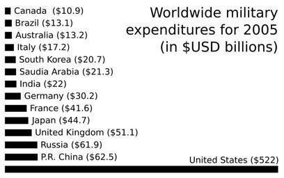 | Keywords: Worldwide military spending 2005 (horizontal).svg thumb upright Vertical version Graphic showing the top 14 worldwide military budgets sorted by country the top 14 cover all countries who spent more than 10 billion on their military in USD billions Data for P R China and Russia is from 2004 expenditures Expenditures are used in a few cases where official budgets are significantly lower than actual spending Not all exact values are shown the goal of the graphic is to show relative amounts and not just duplicate what could otherwise more easily go into a table I've arranged it vertically in order to best work with Wikipedia page layout I've tried to keep things pretty simple following the graphical recommendations that Edward Tufte has written about There is also a vertical version without the title on it Image Worldwide military spending 2005 svg If you want to credit someone credit Wikimedia Commons Otherwise don't credit anyone that's fine by me Die Grafik zeigt die Top 14 Militärbudgets weltweit sortiert nach Land die Top 14 umfasst alle Länder die mehr als 10 Milliarden US-Dollar für ihr Militär ausgegeben haben in Milliarden US-Dollar Data source http //www armscontrolcenter org/archives/002244 php 2006-12-31 Created by User Fastfission using a combination of Microsoft Excel to get the bars the right length then exported to Illustrator and then re-designed in Inkscape --Fastfission 15 06 14 April 2008 UTC translation possible Fastfission Military diagrams |