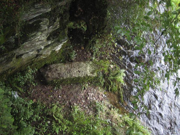 | Keywords: Worthyvale ogham stone.jpg en Inscribed stone on the bank of the River Camel about 150 metres upstream from Slaughter Bridge near Camelford Cornwall CISP WVALE/1 Inscribed LATINI H IC IACIT FILIUS MAGARI in the Latin script and LATINI in the Ogham script see File Worthyvale ogham stone detail JPG for detail showing the now almost illegible Ogham inscription own BabelStone 2010-08-27 Worthyvale ogham stone closeup jpg cc-zero Ogham stones in England Slaughterbridge River Camel | ||||