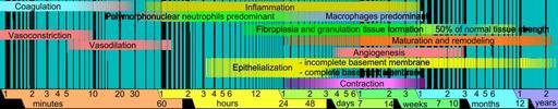 | Keywords: Wound healing phases.png wound healing Limits vary within faded intervals mainly by wound size and healing conditions but image does not include major impairments that cause chronic wounds own from the template Logarithmic time scale - milliseconds to years svg Mikael Häggström gallery of 2014 2010-09-25 References The direct URL link to this reference list is http //commons wikimedia org/wiki/File Wound_healing_phases png References Inflammation and upper limit of beginning of maturation and remodeling as well as its ending http //www worldwidewounds com/2005/august/Schultz/Extrace-Matric-Acute-Chronic-Wounds html worldwidewounds com > http //www worldwidewounds com/2005/august/Schultz/images/New_fig_3 jpg Figure 3 - The time relationship between the different processes of wound healing by Gregory S Schultz Glenn Ladwig and Annette Wysocki - in turn adapted from Asmussen PD Sollner B Mechanism of wound healing In Wound Care Tutorial Medical Series Stuttgart Hippokrates Verlag 1993 Lower limit of beginning of maturation and remodeling and equivalent limit for fibroplasia and granulation tissue formation Fig 9-1 The cellular biochemical and mechanical phases of wound healing cite book Pollock Raphael E ; F Charles Brunicardi; Dana Lynne Andersen; Billiar Timothy R ; Dunn David; Hunter John G ; Matthews Jeffrey J Schwartz's Principles of Surgery Ninth Edition McGraw-Hill Professional 2009 0-07-154769-X Vasoconstriction and vasodilation Stadelmann W K Digenis A G and Tobin G R 1998 Physiology and healing dynamics of chronic cutaneous wounds The American Journal of Surgery 176 2 26S-38S PMID 9777970 Hamilton Ont B C Decker Inc Electronic book Angiogenesis Nguyen D T Orgill D P Murphy G F 2009 Chapter 4 The Pathophysiologic Basis for Wound Healing and Cutaneous Regeneration Biomaterials For Treating Skin Loss CRC Press US Woodhead Publishing UK/Europe Boca Raton/Cambridge p 25-57 ISBN 978-1-4200-9989-9 ISBN 978-1-84569-363-3 Polymorphonuclear neutrophils and ending of fibroplasia and granulation tissue formation de la Torre J Sholar A 2006 Wound healing Chronic wounds Emedicine com Accessed January 20 2008 http //www emedicine com/plastic/topic477 htm Macrophages Expert Reviews in Molecular Medicine 2003 The phases of cutaneous wound healing 5 1 Cambridge University Press Accessed January 20 2008 http //www-ermm cbcu cam ac uk/03005829a pdf Upper limit of beginning of fibroplasia and granulation tissue formation collagen deposition epithelialization and contraction Romo T and Pearson J M 2005 Wound Healing Skin Emedicine com Accessed December 27 2006 Additional note on contraction Mulvaney M and Harrington A 1994 Chapter 7 Cutaneous trauma and its treatment In Textbook of Military Medicine Military Dermatology Office of the Surgeon General Department of the Army Virtual Naval Hospital Project Accessed through web archive on September 15 2007 http //web archive org/web/20031218072356/http //www vnh org/MilitaryDerm/Ch7 pdf Percentage of normal tissue strength Mercandetti M Cohen A J 2005 Wound Healing Healing and Repair Emedicine com Accessed January 20 2008 http //www emedicine com/plastic/topic411 htm Wound healing phases svg Wound healing Logarithmic scale |