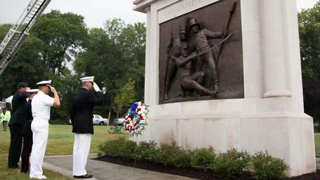 | Keywords: Wounded Commodore Joshua Barney, commander of the Chesapeake Flotilla, memorialized.JPG en The Undaunted in Battle memorial to the Battle of Bladensburg designed and sculpted by Joanna Blake was dedicated at Bladensburg Maryland Aug 23 2014 The monument features a bronze sculpture of the end of the battle It depicts a wounded Commodore Joshua Barney commander of the Chesapeake Flotilla Charles Ball a freed slave and flotilla man and an unnamed Marine in honor of the Marines who fought to the bitter end trying to repel British forces 2014-08-23 12 23 56 VIRIN 140823-M-JU941-013 Marine Corps https //www dvidshub net/image/1524825/war-1812-undaunted-legacy-memorialized Vk_l1FJDiHs Photo by Sgt Justin M Boling USAF PD-USGov other versions PD-USGov-Military-Marines Joshua Barney Ceremonies of the United States Marine Corps Uploaded with UploadWizard Battle of Bladensburg |