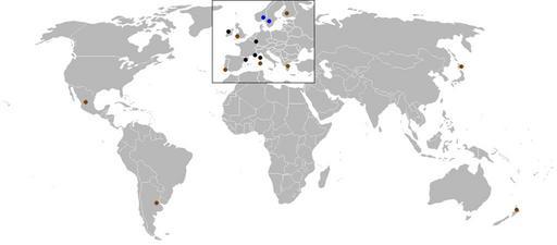 | Keywords: WRC-2007.png Map of World Rally Championship rallies held in 2007 Color coding is black for tarmac events brown for gravel blue for snow/ice and red for mixed surface events 2007-03-27 Josh Baumgartner Josh 16 39 27 March 2007 UTC Public domain World Rally Championship maps 2007 in World Rally Championship |