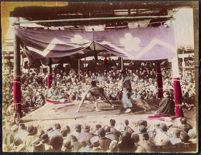 | Keywords: Wrestling at Tokyo 1890s.jpg Wrestling at Tokyo Two wrestlers engaging in a match of sumo in a ring at Tokyo with referees standing and sitting nearby and a large crowd of japanese in western-style clothing watching Hand-colored albumen photograph by unknown photographer 1890s Black and white photographs of sumo Tokyo in the 1890s PD-Art Artworks missing infobox template |