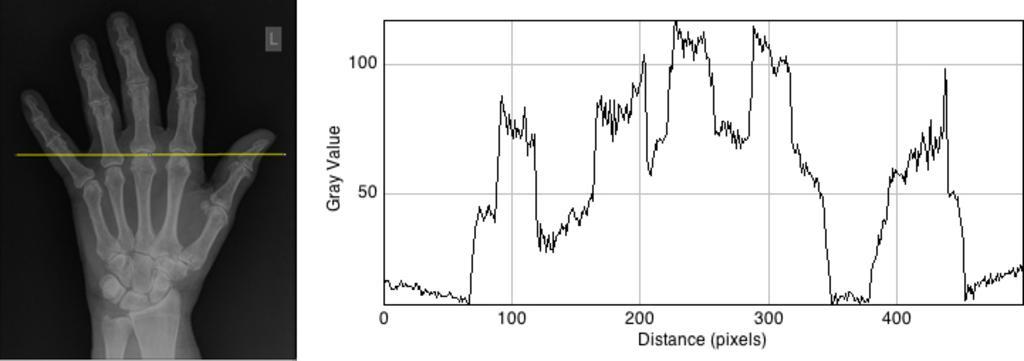 Keywords: WristInvertedPlot.jpg en A radiograph of the wrist and gray level profile for the yellow horizontal line own Kieranmaher 2011-02-03 Physics diagrams