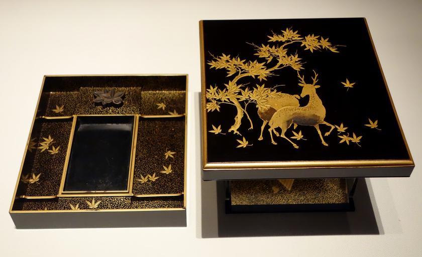 | Keywords: Writing box, Edo period, 18th century, maple and deer design in maki-e lacquer - Tokyo National Museum - DSC05144.JPG en Lacquerware exhibit in the Tokyo National Museum Tokyo Japan This artwork is old enough so that it is in the public domain 2013-09-02 21 29 11 own Daderot PD-100 cc-zero Edo lacquerware in the Tokyo National Museum Uploaded with UploadWizard Maki-e | ||||