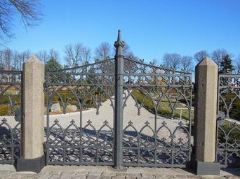 Keywords: wrought iron gates old patterned fine metal cement poles cemetery gates grey iron blue sky sunny day