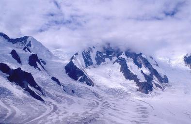 Keywords: WRST Cloudy Glacier.jpg A glacier in Wrangell-St Elias National Park and Preserve Alaska USA Photographed from small prop plane Own 2002-08 Douglaspperkins Glaciers of Wrangell-St Elias National Park and Preserve