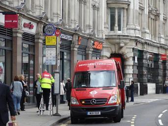 Keywords: vehicle outdoor road car CLOSING BUS STOPS IN THE CITY OF LONDON DUE TO AN INCIDENT. CLOSING BUS STOPS IN THE CITY OF LONDON DUE TO AN INCIDENT.