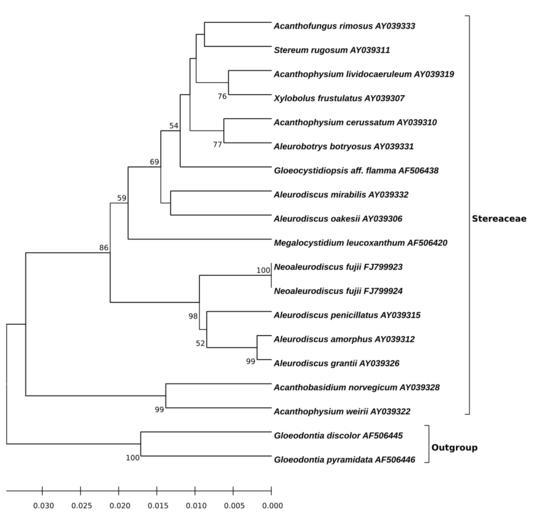 | Keywords: Wu-UPGMA-Tree-Acanthobasidium-Aleurodiscus-Neoaleurodiscus.svg Figure Evolutionary relationships of Acanthobasidium Aleurodiscus s s and Neoaleurodiscus The evolutionary history was inferred using the UPGMA method 1 The optimal tree with the sum of branch length 0 27259509 is shown The percentage of replicate trees in which the associated taxa clustered together in the bootstrap test 1000 replicates are shown next to the branches Only Bootstrap values more than 50 are shown 2 The tree is drawn to scale with branch lengths in the same units as those of the evolutionary distances used to infer the phylogenetic tree The evolutionary distances were computed using the Kimura 2-parameter method 3 and are in the units of the number of base substitutions per site The analysis involved 19 nucleotide sequences All positions with less than 95 site coverage were eliminated That is fewer than 5 alignment gaps missing data and ambiguous bases were allowed at any position There were a total of 812 positions in the final dataset Evolutionary analyses were conducted in MEGA6 4 <br/> For all taxa the GenBank number of the DNA-sequence is shown For the tree the same sequences are used which Sheng-Hua Wu used for his most parsimonious tree 5<br/> <br/> 1 Sneath P H A and Sokal R R 1973 Numerical Taxonomy Freeman San Francisco <br/> 2 Felsenstein J 1985 Confidence limits on phylogenies An approach using the bootstrap Evolution 39 783-791 <br/> 3 Kimura M 1980 A simple method for estimating evolutionary rate of base substitutions through comparative studies of nucleotide sequences Journal of Molecular Evolution 16 111-120 <br/> 4 Tamura K Stecher G Peterson D Filipski A and Kumar S 2013 MEGA6 Molecular Evolutionary Genetics Analysis version 6 0 Molecular Biology and Evolution30 2725-2729 <br/> 5 Sheng-Hua Wu Dong-Mei Wang Shi-Yi Yu Neoaleurodiscus fujii a new genus and new species found at the timberline in Japan In The Mycological Society of America Hrsg Mycologia Vol 102 1 Lawrence 2010 S 217 “223<br/> ; List with GenBank Sequences http //www ncbi nlm nih gov/nuccore/AY039326 Aleurodiscus grantii strain T569 http //www ncbi nlm nih gov/nuccore/AY039312 Aleurodiscus amorphus strain HHB15282 http //www ncbi nlm nih gov/nuccore/AF506397 Aleurodiscus amorphus - AF506397 http //www ncbi nlm nih gov/nuccore/AY039315 Acanthobasicium penicillatum strain T322 http //www ncbi nlm nih gov/nuccore/AY039322 Aleurodiscus weirii strain HHB12678 http //www ncbi nlm nih gov/nuccore/AY039328 Acanthobasidium norvegicum strain T623 http //www ncbi nlm nih gov/nuccore/AY039317 Acanthobasidium aurantius strain T621 http //www ncbi nlm nih gov/nuccore/FJ799924 Neoaleurodiscus fujii strain Wu0807-41 http //www ncbi nlm nih gov/nuccore/FJ799923 Neoaleurodiscus fujii strain Wu0807-40 http //www ncbi nlm nih gov/nuccore/AF506445 Gloeodontia discolor AF506445 http //www ncbi nlm nih gov/nuccore/AF506446 Gloeodontia pyramidata AF506446 http //www ncbi nlm nih gov/nuccore/AY039333 Acanthofungus rimosus AY039333 http //www ncbi nlm nih gov/nuccore/AY039311 Stereum rugosum AY039311 http //www ncbi nlm nih gov/nuccore/AY039319 Acanthophysium lividocaeruleum AY039319 http //www ncbi nlm nih gov/nuccore/AY039307 Xylobolus frustulatus AY039307 http //www ncbi nlm nih gov/nuccore/AY039310 Acanthophysium cerussatum AY039310 http //www ncbi nlm nih gov/nuccore/AY039331 Aleurobotrys botryosus AY039331 http //www ncbi nlm nih gov/nuccore/AF506438 Gloeocystidiopsis aff flamma AF506438 http //www ncbi nlm nih gov/nuccore/AY039332 Aleurodiscus mirabilis AY039332 http //www ncbi nlm nih gov/nuccore/AY039306 Aleurodiscus oakesii AY039306 http //www ncbi nlm nih gov/nuccore/AF506420 Megalocystidium leucoxanthum AF506420 own 2014-08-19 Thkgk Cc-zero Acanthobasidium Aleurodiscus penicillatus Aleurodiscus Neoaleurodiscus |