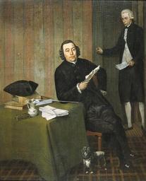 | Keywords: Wybrand Hendriks - Wernerus Köhne met zijn knecht Jan Bosch.jpg Artwork Q17342879 Creator Wybrand Hendriks Portret van Wernerus Köhne 1725/26-1788 notaris in Haarlem met zijn klerk Jan Bosch <ref>http //www rkd nl/rkddb/dispatcher aspx action search database ChoiceImages search priref 5255 RKDimages Kunstwerknummer 5255 </ref> Alternate titles LangSwitch Notary Köhne and his Clerk <ref>Marius 1908 </ref> Wernerus Köhne 1725/26-88 Notaris te Haarlem met zijn knecht Jan Bosch <ref>https //www rijksmuseum nl/collectie/SK-C-532 Rijksmuseum Amsterdam - Nationaal Museum voor Kunst en Geschiedenis </ref> 1787 Oil on canvas cm 63 51 Institution Rijksmuseum 5255 object history ProvenanceEvent 1899 loan LangSwitch das the au het Rijksmuseum Amsterdam www rijksmuseum nl http //www rijksmuseum nl/ lang en Home https //www rijksmuseum nl/collectie/SK-C-532 Info https //www rijksmuseum nl/assetimage2 jsp id SK-C-532 Pic SK-C-532 Other versions <table style background-color EEEFFF > <tr> <td> 500x120px none none span </td> <td valign top > File Dutch Painting in the 19th Century - Hendriks - Notary Köhne and his Clerk png<br />Version from Gerharda Hermina Marius 1908 Dutch Art in the Nineteenth Century London Alexander Moring Ltd </td> </tr> </table> PD-old-100 LangSwitch References Noten <references /> ImageNote 1 32 781 159 61 775 960 2 LangSwitch Signed and dated Signé et daté Gesigneerd en gedateerd W Hendriks / Pinxit 1787 ImageNoteEnd 1 DEFAULTSORT 1787; Wernerus Köhne Wybrand Hendriks Paintings by Wybrand Hendriks in the Rijksmuseum Amsterdam Hendriks Wybrand 1780s paintings in the Netherlands Portrait 1787 oil on canvas paintings Portrait 1787 portrait paintings Male 1788 deaths 18th-century men of the Netherlands 18th-century oil portraits of sitting men at full length 18th-century portrait paintings in the Rijksmuseum Amsterdam 18th-century portrait paintings with dogs Black clothing in art male Breeches in art Chairs in portrait paintings Left hand on hip in portrait paintings Notaries in art People of Haarlem Portrait paintings of men with dogs Portrait paintings of men with tricorne hats Portraits with letters Portraits with secretary Powdered wigs in art Tables in portrait paintings Wigs in art |