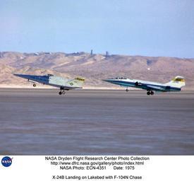 | Keywords: X-24B Landing on Lakebed with F-104N Chase DVIDS729857.jpg en This 1975 photo shows the X-24B with a Lockheed F-104N chase plane in formation beside it gliding to a landing on Rogers Dry Lake adjacent to the NASA Flight Research Center Edwards California after a 1972 research flight The X-24 was one of a group of lifting bodies flown by the NASA Flight Research Center now Dryden Flight Research Center Edwards California in a joint program with the U S Air Force at Edwards Air Force Base from 1963 to 1975 The lifting bodies were used to demonstrate the ability of pilots to maneuver and safely land wingless vehicles designed to fly back to Earth from space and be landed like an airplane at a predetermined site Lifting bodies' aerodynamic lift essential to flight in the atmosphere was obtained from their shape The addition of fins and control surfaces allowed the pilots to stabilize and control the vehicles and regulate their flight paths Built by Martin Aircraft Company Maryland for the U S Air Force the X-24A was a bulbous vehicle shaped like a teardrop with three vertical fins at the rear for directional control It weighed 6 270 pounds was 24 5 feet long and 11 5 feet wide measuring just the fuselage not the distance between the tips of the outboard fins Its first unpowered glide flight was on April 17 1969 with Air Force Maj Jerauld Gentry at the controls Gentry also piloted its first powered flight on March 19 1970 The X-24A was flown 28 times in the program that like the HL-10 validated the concept that a Space Shuttle vehicle could be landed unpowered The fastest speed achieved by the X-24A was 1 036 miles per hour mph-Mach 1 6 Its maximum altitude was 71 400 feet It was powered by an XLR-11 rocket engine with a maximum theoretical vacuum thrust of 8 480 pounds The X-24A was later modified into the X-24B The bulbous shape of the X-24A was converted into a flying flatiron shape with a rounded top flat bottom and double delta platform that ended in a pointed nose The X-24B demonstrated that accurate unpowered reentry vehicle landings were operationally feasible Top speed achieved by the X-24B was 1 164 mph and the highest altitude it reached was 74 130 feet The vehicle is on display at the Air Force Museum Wright-Patterson Air Force Base Ohio The pilot on the last powered flight of the X-24B was Bill Dana who also flew the last X-15 flight about seven years earlier The X-24A shape was later borrowed for the X-38 Crew Return Vehicle CRV technology demonstrator for the International Space Station The X-24B is on public display at the Air Force Museum Wright-Patterson AFB Ohio NASA Identifier NIX_ECN-4351 2009-12-10 Glenn Research Center https //www dvidshub net/image/729857 729857 2012-10-17 16 06 WASHINGTON DC US PD-USGov Images from DoD uploaded by Fæ 1975 in aviation in the United States Lockheed F-104 in NASA service Martin-Marietta X-24 Aircraft at Rogers Dry Lake |