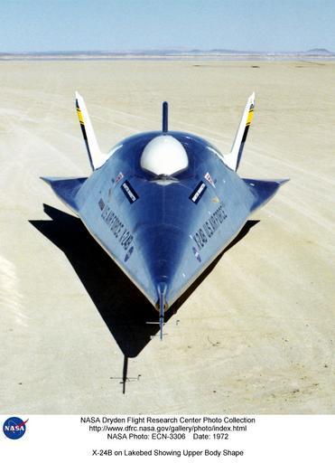 | Keywords: X-24B on Lakebed Showing Upper Body Shape DVIDS708511.jpg en The sleek futuristic shape of the X-24B lifting body research vehicle can be clearly seen in this look-down view of the aircraft on Rogers Dry Lake adjacent to the NASA Flight Research Center Edwards California The X-24 was one of a group of lifting bodies flown by the NASA Flight Research Center now Dryden Flight Research Center Edwards California in a joint program with the U S Air Force at Edwards Air Force Base from 1963 to 1975 The lifting bodies were used to demonstrate the ability of pilots to maneuver and safely land wingless vehicles designed to fly back to Earth from space and be landed like an airplane at a predetermined site Lifting bodies' aerodynamic lift essential to flight in the atmosphere was obtained from their shape The addition of fins and control surfaces allowed the pilots to stabilize and control the vehicles and regulate their flight paths Built by Martin Aircraft Company Maryland for the U S Air Force the X-24A was a bulbous vehicle shaped like a teardrop with three vertical fins at the rear for directional control It weighed 6 270 pounds was 24 5 feet long and 11 5 feet wide measuring just the fuselage not the distance between the tips of the outboard fins Its first unpowered glide flight was on April 17 1969 with Air Force Maj Jerauld Gentry at the controls Gentry also piloted its first powered flight on March 19 1970 The X-24A was flown 28 times in the program that like the HL-10 validated the concept that a Space Shuttle vehicle could be landed unpowered The fastest speed achieved by the X-24A was 1 036 miles per hour mph-Mach 1 6 Its maximum altitude was 71 400 feet It was powered by an XLR-11 rocket engine with a maximum theoretical vacuum thrust of 8 480 pounds The X-24A was later modified into the X-24B The bulbous shape of the X-24A was converted into a flying flatiron shape with a rounded top flat bottom and double delta platform that ended in a pointed nose The X-24B demonstrated that accurate unpowered reentry vehicle landings were operationally feasible Top speed achieved by the X-24B was 1 164 mph and the highest altitude it reached was 74 130 feet The vehicle is on display at the Air Force Museum Wright-Patterson Air Force Base Ohio The pilot on the last powered flight of the X-24B was Bill Dana who also flew the last X-15 flight about seven years earlier The X-24A shape was later borrowed for the X-38 Crew Return Vehicle CRV technology demonstrator for the International Space Station The X-24B is on public display at the Air Force Museum Wright-Patterson AFB Ohio NASA Identifier NIX_ECN-3306 2009-12-10 Glenn Research Center https //www dvidshub net/image/708511 708511 2012-10-10 16 25 WASHINGTON DC US PD-USGov Aircraft at Rogers Dry Lake Images from DoD uploaded by Fæ Martin-Marietta X-24 |