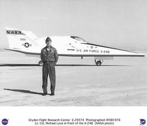 | Keywords: X-24B with Test Pilot Lt. Col. Michael V. Love DVIDS687766.jpg en This photo shows Air Force Lieutenant Colonel Michael V Love in front of the X-24B lifting body research vehicle at Edwards Air Force Base in 1976 Love was assigned as a project pilot on the joint NASA-USAF X-24B Lifting Body flight test program at the NASA Flight Research Center He made a total of 12 flights in the plane from October 4 1973 until July 15 1975 Love flew it to a speed of Mach 1 76 on October 25 1974 a record for the X-24B Love attended the USAF Test Pilot School and remained as an instructor there from 1969 through 1971 He was a test pilot at Edwards when assigned to fly to the X-24B Love was a combat veteran of Vietnam and was awarded the Distinguished Flying Cross with two Oak Leaf clusters Love perished while attempting an emergency landing in an RF-4C on March 1 1976 - less than a month after this photo was taken The X-24B was the last aircraft to fly in the Dryden Flight Research Center's manned lifting body program The X-24 was one of a group of lifting bodies flown by the NASA Flight Research Center now Dryden Flight Research Center Edwards California in a joint program with the U S Air Force at Edwards Air Force Base from 1963 to 1975 The lifting bodies were used to demonstrate the ability of pilots to maneuver and safely land wingless vehicles designed to fly back to Earth from space and be landed like an airplane at a predetermined site Lifting bodies' aerodynamic lift essential to flight in the atmosphere was obtained from their shape The addition of fins and control surfaces allowed the pilots to stabilize and control the vehicles and regulate their flight paths Built by Martin Aircraft Company Maryland for the U S Air Force the X-24A was a bulbous vehicle shaped like a teardrop with three vertical fins at the rear for directional control It weighed 6 270 pounds was 24 5 feet long and 11 5 feet wide measuring just the fuselage not the distance between the tips of the outboard fins Its first unpowered glide flight was on April 17 1969 with Air Force Maj Jerauld Gentry at the controls Gentry also piloted its first powered flight on March 19 1970 The X-24A was flown 28 times in the program that like the HL-10 validated the concept that a Space Shuttle vehicle could be landed unpowered The fastest speed achieved by the X-24A was 1 036 miles per hour mph--Mach 1 6 Its maximum altitude was 71 400 feet It was powered by an XLR-11 rocket engine with a maximum theoretical vacuum thrust of 8 480 pounds The X-24A was later modified into the X-24B The bulbous shape of the X-24A was converted into a flying flatiron shape with a rounded top flat bottom and double delta platform that ended in a pointed nose The X-24B demonstrated that accurate unpowered reentry vehicle landings were operationally feasible Top speed achieved by the X-24B was 1 164 mph and the highest altitude it reached was 74 130 feet The vehicle is on display at the Air Force Museum Wright-Patterson Air Force Base Ohio The pilot on the last powered flight of the X-24B was Bill Dana who also flew the last X-15 flight about seven years earlier The X-24A shape was later borrowed for the X-38 Crew Return Vehicle CRV technology demonstrator for the International Space Station The X-24B is on public display at the Air Force Museum Wright-Patterson AFB Ohio NASA Identifier NIX-E-29374 2009-09-23 Glenn Research Center https //www dvidshub net/image/687766 687766 2012-10-10 11 45 WASHINGTON DC US PD-USGov Aircraft at Rogers Dry Lake Martin-Marietta X-24 Images from DoD uploaded by Fæ |