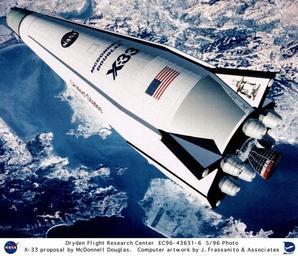 | Keywords: X-33 Proposal by McDonnell Douglas - Computer Graphic DVIDS739776.jpg en This artist's rendering depicts the McDonnell Douglas X-33 proposal for a technology demonstrator of a Single-Stage-To-Orbit SSTO Reusable Launch Vehicle RLV McDonnell Douglas submitted a vertical landing configuration design which used liquid oxygen/hydrogen bell engines NASA considered design submissions from Rockwell Lockheed Martin and McDonnell Douglas NASA selected Lockheed Martin's design on 2 July 1996 NASA's Dryden Flight research Center Edwards California expected to play a key role in the development and flight testing of the X-33 The RLV technology program was a cooperative agreement between NASA and industry The goal of the RLV technology program was to enable significant reductions in the cost of access to space and to promote the creation and delivery of new space services and other activities that was to have improved U S economic competitiveness The X-33 was a wedged-shaped subscale technology demonstrator prototype of a potential future Reusable Launch Vehicle RLV that Lockheed Martin had dubbed VentureStar The company had hoped to develop VentureStar early this century Through demonstration flight and ground research NASA's X-33 program was to have provided the information needed for industry representatives such as Lockheed Martin to decide whether to proceed with the development of a full-scale commercial RLV program A full-scale single-stage-to-orbit RLV was to have dramatically increased reliability and lowered the costs of putting a pound of payload into space from the current figure of 10 000 to 1 000 Reducing the cost associated with transporting payloads in Low Earth Orbit LEO by using a commercial RLV was to have created new opportunities for space access and significantly improved U S economic competitiveness in the world-wide launch marketplace NASA expected to be a customer not the operator of the commercial RLV The X-33 design was based on a lifting body shape with two revolutionary linear aerospike rocket engines and a rugged metallic thermal protection system The vehicle also had lightweight components and fuel tanks built to conform to the vehicle's outer shape Time between X-33 flights was normally to have been seven days but the program hoped to demonstrate a two-day turnaround between flights during the flight-test phase of the program The X-33 was to have been an unpiloted vehicle that took off vertically like a rocket and landed horizontally like an airplane It was to have reached altitudes of up to 50 miles and high hypersonic speeds The X-33 program was managed by the Marshall Space Flight Center and was to have been launched at a special launch site on Edwards Air Force Base Due to technical problems with the liquid hydrogen fuel tanks and the resulting cost increase and time delay the X-33 program was cancelled in February 2001 NASA Identifier NIX-EC96-43631-6 2009-09-23 Glenn Research Center https //www dvidshub net/image/739776 739776 2012-10-18 01 09 WASHINGTON DC US PD-USGov Edwards Air Force Base Images from DoD uploaded by Fæ X-33 |