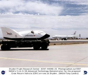 | Keywords: X-38 Arrival at NASA Dryden on June 4, 1997 DVIDS684645.jpg en control system and a bank of batteries for internal power The actual CRV to be flown in space was expected to be 30 feet long The X-38 project is a joint effort between the Johnson Space Center Houston Texas JSC Langley Research Center Hampton Virginia LaRC and Dryden Flight Research Center Edwards California DFRC with the program office located at JSC A contract was awarded to Scaled Composites Inc Mojave California for construction of the X-38 test airframes The first vehicle was delivered to the JSC in September 1996 The vehicle was fitted with avionics computer systems and other hardware at Johnson A second vehicle was delivered to JSC in December 1996 Flight research with the X-38 at Dryden began with an unpiloted captive-carry flight in which the vehicle remained attached to its future launch vehicle Dryden's B-52 008 There were four captive flights in 1997 and three in 1998 plus the first drop test on March 12 1998 using the parachutes and parafoil Further captive and drop tests occurred in 1999 In March 2000 Vehicle 132 completed its third and final free flight in the highest fastest and longest X-38 flight to date It was released at an altitude of 39 000 feet and flew freely for 45 seconds reaching a speed of over 500 miles per hour before deploying its parachutes for a landing on Rogers Dry Lakebed In the drop tests the X-38 vehicles have been autonomous after airlaunch from the B-52 After they deploy the parafoil they have remained autonomous but there is also a manual mode with controls from the ground NASA's first X-38 Advanced Technology Demonstrator for the proposed Crew Return Vehicle CRV arrives at NASA's Dryden Flight Research Center Edwards California in June 1997 The vehicle arrived aboard a USAF C-17 transport aircraft from NASA's Johnson Space Center JSC and is seen here on the ramp with NASA's Boeing 747 Shuttle Carrier Aircraft SCA in the background The X-38 Crew Return Vehicle CRV research project is designed to develop the technology for a prototype emergency crew return vehicle or lifeboat for the International Space Station The project is also intended to develop a crew return vehicle design that could be modified for other uses such as a joint U S and international human spacecraft that could be launched on the French Ariane-5 Booster The X-38 project is using available technology and off-the-shelf equipment to significantly decrease development costs Original estimates to develop a capsule-type crew return vehicle were estimated at more than 2 billion X-38 project officials have estimated that development costs for the X-38 concept will be approximately one quarter of the original estimate Off-the-shelf technology is not necessarily old technology Many of the technologies being used in the X-38 project have never before been applied to a human-flight spacecraft For example the X-38 flight computer is commercial equipment currently used in aircraft and the flight software operating system is a commercial system already in use in many aerospace applications The video equipment for the X-38 is existing equipment some of which has already flown on the space shuttle for previous NASA experiments The X-38's primary navigational equipment the Inertial Navigation System/Global Positioning System is a unit already in use on Navy fighters The X-38 electromechanical actuators come from previous joint NASA U S Air Force and U S Navy research and development projects Finally an existing special coating developed by NASA will be used on the X-38 thermal tiles to make them more durable than those used on the space shuttles The X-38 itself was an unpiloted lifting body designed at 80 percent of the size of a projected emergency crew return vehicle for the International Space Station although two later versions were planned at 100 percent of the CRV size The X-38 and the actual CRV are patterned after a lifting-body shape first employed in the Air Force-NASA X-24 lifting-body project in the early to mid-1970s The current vehicle design is base lined with life support supplies for about nine hours of orbital free flight from the space station It's landing will be fully automated with backup systems which allow the crew to control orientation in orbit select a deorbit site and steer the parafoil if necessary The X-38 vehicles designated V131 V132 and V-131R are 28 5 feet long 14 5 feet wide and weigh approximately 16 000 pounds on average The vehicles have a nitrogen-gas-operated attitude NASA Identifier NIX-EC97-44096-25 2009-12-09 Glenn Research Center https //www dvidshub net/image/684645 684645 2012-10-10 11 02 WASHINGTON DC US PD-USGov Langley Research Center Images from DoD uploaded by Fæ NASA X-38 N911NA aircraft |
