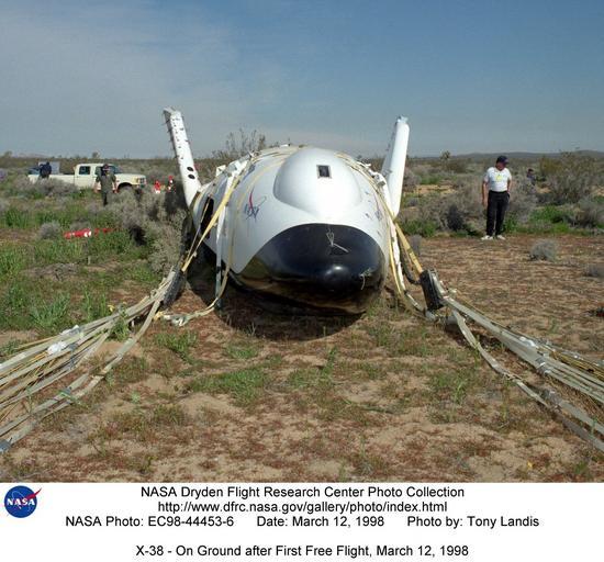 | Keywords: X-38 - On Ground after First Free Flight, March 12, 1998 DVIDS726732.jpg en Crew members surround the X-38 lifting body research vehicle after a successful test flight and landing in March 1998 The flight was the first free flight for the vehicle and took place at the Dryden Flight Research Center Edwards California The X-38 Crew Return Vehicle CRV research project is designed to develop the technology for a prototype emergency crew return vehicle or lifeboat for the International Space Station The project is also intended to develop a crew return vehicle design that could be modified for other uses such as a joint U S and international human spacecraft that could be launched on the French Ariane-5 Booster The X-38 project is using available technology and off-the-shelf equipment to significantly decrease development costs Original estimates to develop a capsule-type crew return vehicle were estimated at more than 2 billion X-38 project officials have estimated that development costs for the X-38 concept will be approximately one quarter of the original estimate Off-the-shelf technology is not necessarily old technology Many of the technologies being used in the X-38 project have never before been applied to a human-flight spacecraft For example the X-38 flight computer is commercial equipment currently used in aircraft and the flight software operating system is a commercial system already in use in many aerospace applications The video equipment for the X-38 is existing equipment some of which has already flown on the space shuttle for previous NASA experiments The X-38's primary navigational equipment the Inertial Navigation System/Global Positioning System is a unit already in use on Navy fighters The X-38 electromechanical actuators come from previous joint NASA U S Air Force and U S Navy research and development projects Finally an existing special coating developed by NASA will be used on the X-38 thermal tiles to make them more durable than those used on the space shuttles The X-38 itself was an unpiloted lifting body designed at 80 percent of the size of a projected emergency crew return vehicle for the International Space Station although two later versions were planned at 100 percent of the CRV size The X-38 and the actual CRV are patterned after a lifting-body shape first employed in the Air Force-NASA X-24 lifting-body project in the early to mid-1970s The current vehicle design is base lined with life support supplies for about nine hours of orbital free flight from the space station It's landing will be fully automated with backup systems which allow the crew to control orientation in orbit select a deorbit site and steer the parafoil if necessary The X-38 vehicles designated V131 V132 and V-131R are 28 5 feet long 14 5 feet wide and weigh approximately 16 000 pounds on average The vehicles have a nitrogen-gas-operated attitude control system and a bank of batteries for internal power The actual CRV to be flown in space was expected to be 30 feet long The X-38 project is a joint effort between the Johnson Space Center Houston Texas JSC Langley Research Center Hampton Virginia LaRC and Dryden Flight Research Center Edwards California DFRC with the program office located at JSC A contract was awarded to Scaled Composites Inc Mojave California for construction of the X-38 test airframes The first vehicle was delivered to the JSC in September 1996 The vehicle was fitted with avionics computer systems and other hardware at Johnson A second vehicle was delivered to JSC in December 1996 Flight research with the X-38 at Dryden began with an unpiloted captive-carry flight in which the vehicle remained attached to its future launch vehicle Dryden's B-52 008 There were four captive flights in 1997 and three in 1998 plus the first drop test on March 12 1998 using the parachutes and parafoil Further captive and drop tests occurred in 1999 In March 2000 Vehicle 132 completed its third and final free flight in the highest fastest and longest X-38 flight to date It was released at an altitude of 39 000 feet and flew freely for 45 seconds reaching a speed of over 500 miles per hour before deploying its parachutes for a landing on Rogers Dry Lakebed In the drop tests the X-38 vehicles have been autonomous after airlaunch from the B-52 After they deploy the parafoil they have remained autonomous but there is also a manual mode with controls from the ground NASA Identifier NIX-EC98-44453-6 2009-12-09 Glenn Research Center https //www dvidshub net/image/726732 726732 2012-10-17 13 25 WASHINGTON DC US PD-USGov Langley Research Center Images from DoD uploaded by Fæ NASA X-38 |