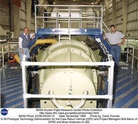 | Keywords: X-38 Prototype Technology Demonstrator for the Crew Return Vehicle (CRV) and Project Managers Bob Ba DVIDS718666.jpg en Bob Baron of the Dryden Flight Research Center left and Brian Anderson of the Johnson Space Flight Center right flank an X-38 prototype Crew Return Vehicle technology demonstrator under construction at the Johnson Space Center Houston Texas The X-38 Crew Return Vehicle CRV research project is designed to develop the technology for a prototype emergency crew return vehicle or lifeboat for the International Space Station The project is also intended to develop a crew return vehicle design that could be modified for other uses such as a joint U S and international human spacecraft that could be launched on the French Ariane-5 Booster The X-38 project is using available technology and off-the-shelf equipment to significantly decrease development costs Original estimates to develop a capsule-type crew return vehicle were estimated at more than 2 billion X-38 project officials have estimated that development costs for the X-38 concept will be approximately one quarter of the original estimate Off-the-shelf technology is not necessarily old technology Many of the technologies being used in the X-38 project have never before been applied to a human-flight spacecraft For example the X-38 flight computer is commercial equipment currently used in aircraft and the flight software operating system is a commercial system already in use in many aerospace applications The video equipment for the X-38 is existing equipment some of which has already flown on the space shuttle for previous NASA experiments The X-38's primary navigational equipment the Inertial Navigation System/Global Positioning System is a unit already in use on Navy fighters The X-38 electromechanical actuators come from previous joint NASA U S Air Force and U S Navy research and development projects Finally an existing special coating developed by NASA will be used on the X-38 thermal tiles to make them more durable than those used on the space shuttles The X-38 itself was an unpiloted lifting body designed at 80 percent of the size of a projected emergency crew return vehicle for the International Space Station although two later versions were planned at 100 percent of the CRV size The X-38 and the actual CRV are patterned after a lifting-body shape first employed in the Air Force-NASA X-24 lifting-body project in the early to mid-1970s The current vehicle design is base lined with life support supplies for about nine hours of orbital free flight from the space station It's landing will be fully automated with backup systems which allow the crew to control orientation in orbit select a deorbit site and steer the parafoil if necessary The X-38 vehicles designated V131 V132 and V-131R are 28 5 feet long 14 5 feet wide and weigh approximately 16 000 pounds on average The vehicles have a nitrogen-gas-operated attitude control system and a bank of batteries for internal power The actual CRV to be flown in space was expected to be 30 feet long The X-38 project is a joint effort between the Johnson Space Center Houston Texas JSC Langley Research Center Hampton Virginia LaRC and Dryden Flight Research Center Edwards California DFRC with the program office located at JSC A contract was awarded to Scaled Composites Inc Mojave California for construction of the X-38 test airframes The first vehicle was delivered to the JSC in September 1996 The vehicle was fitted with avionics computer systems and other hardware at Johnson A second vehicle was delivered to JSC in December 1996 Flight research with the X-38 at Dryden began with an unpiloted captive-carry flight in which the vehicle remained attached to its future launch vehicle Dryden's B-52 008 There were four captive flights in 1997 and three in 1998 plus the first drop test on March 12 1998 using the parachutes and parafoil Further captive and drop tests occurred in 1999 In March 2000 Vehicle 132 completed its third and final free flight in the highest fastest and longest X-38 flight to date It was released at an altitude of 39 000 feet and flew freely for 45 seconds reaching a speed of over 500 miles per hour before deploying its parachutes for a landing on Rogers Dry Lakebed In the drop tests the X-38 vehicles have been autonomous after airlaunch from the B-52 After they deploy the parafoil they have remained autonomous but there is also a manual mode with controls from the ground NASA Identifier NIX-EC99-45255-10 2009-09-23 Glenn Research Center https //www dvidshub net/image/718666 718666 2012-10-10 18 36 WASHINGTON DC US PD-USGov Langley Research Center Images from DoD uploaded by Fæ NASA X-38 |