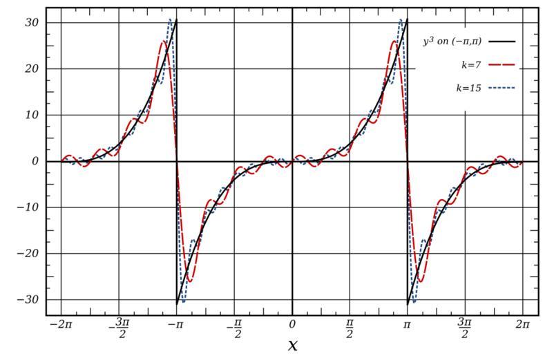 Keywords: XCubed Fourier Series Approximation n=7,15.svg This is a graph of x<sup>3</sup> periodic on - with the Fourier Series Approximations drawn in at k 7 red and k 15 blue The approximation is given by <math>f\left x \right \approx \sum\limits_ n 1 k - 2\left - 1 \right n \left \pi 2 n 2 - 6 \right \over n 3 \sin \left nx \right </math> This is the counterpart to this which has just the original function drawn in Own Drawing Plotted in Mathematica edited in Inkscape 2008-02-22 Inductiveload image XCubed Periodic -pi pi svg Mathematica Code <pre><nowiki> fx_ x 3; ffourx_ k_ Hold Sum -2 -1 n Pi 2 n 2 - 6 / n 3 Sinn x n 1 k ; Plot fModx 2 \Pi -\Pi ReleaseHoldffourx 7 ReleaseHoldffourx 15 x -2 Pi 2 Pi </nowiki></pre> Fourier series |