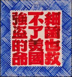 | Keywords: Xi jun ye jiu bu liao Meiguo qiang dao de ming = Even germs cannot save the fate of the American bandits..JPG en A statement in twelve bold red characters written in Chinese traditional style and framed with indigo blue pattern proclaims that not even germs can save American bandits 2013-09-27 09 11 53 Courtesy of the National Library of Medicine Images from the History of Medicine IHM http //ihm nlm nih gov/images/E00172 Also showcased in the book Hidden Treasure New York NY Blast Books 2012 p 198 HMD Prints Photos call number PP060179 map China s n 1952 Custom license marker 2013 09 27 PD-USGov Uploaded with UploadWizard Biological warfare Korean War Posters Anti-American propaganda |