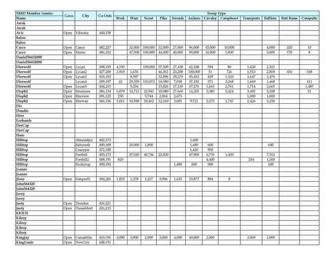 Keywords: XR8D Armies P1.jpg en spreadsheet for armies in game own Littlebug79 2010-02-18 Tables information