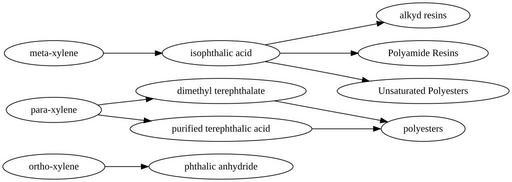 | Keywords: Xylene chemical production network.svg Petrochemical Produced using Graphviz Source code is below <pre>digraph G rankdir LR ortho-xylene -> phthalic anhydride para-xylene -> dimethyl terephthalate dimethyl terephthalate -> polyesters para-xylene -> purified terephthalic acid purified terephthalic acid -> polyesters meta-xylene -> isophthalic acid isophthalic acid -> alkyd resins isophthalic acid -> Polyamide Resins isophthalic acid -> Unsaturated Polyesters </pre> own Mr3641 2010-10-25 Xylene Chemical processes |