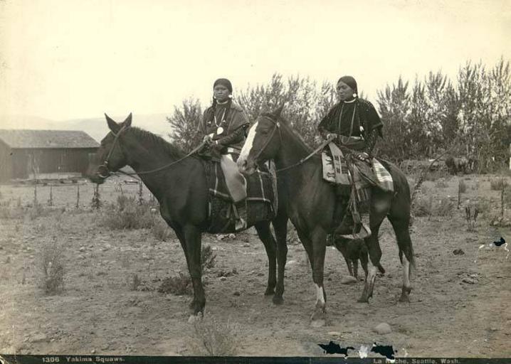 MAKE A MEME View Large Image Yakama Indian women on horseback, Washington, 1899 (LAROCHE 169).jpeg Photograph Creator Frank La Roche Two Yakama women pose on horseback in pasture; in background is a barn and a horse-drawn wagon The women are wearing traditional ...