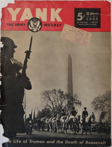 | Keywords: Yank The Army Weekly, May 11, 1945 (The Life of Truman and the Death of Roosevelt).jpg en Caption The body of our late President and Commander in Chief if borne along Washington's Constitution Avenue toward the White House His flag-draped coffin is carried on a caisson drawn by six white horses Photography by Sgt John Frano 1945 Yank The Army Weekly May 11 1945 Sgt John Frano PD-USGov Uploaded with UploadWizard Yank the Army Weekly covers | ||||