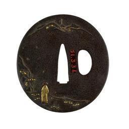 | Keywords: Yasuda Masasada - Tsuba with Chinese Star Gods - Walters 51336 - Back.jpg The three Chinese star gods Lu Fu and Shou are collectively worshiped to bring good fortune The stars appear at the upper left of the tsuba just above the distant mountains At the lower right of the composition the personifications of the stars stand beneath a pine tree A fourth man has his back to the viewer observing them On the reverse another Chinese gentleman stands gazing to the left In the mountains behind him the top of a temple pagoda stands among the mountain peaks 1st half Other date century 18 mid Edo iron silver gold shakudo cm 6 98 6 58 0 43 accession number 51 336 28742 Henry Walters Baltimore date and mode of acquisition unknown Walters Art Museum Henry Walters Acquired by Henry Walters Signature Masasada place of origin Edo present-day Tokyo Japan Walters Art Museum license Tosogu Japanese sword fittings in the Walters Art Museum Yasuda Masasada Media contributed by the Walters Art Museum needs category review |