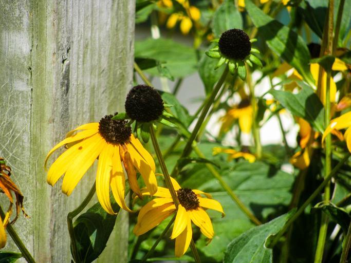 Keywords: plant flowers yellow sunflowers wood post green leaves outdoor nature public domain publicdomain flower License: Public Domain Dedication (CC0) Source: MMT License: Public Domain Dedication (CC0) Source: MMT