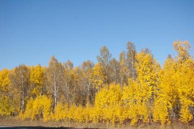 Keywords: yellow trees yellow autumn leaves clear day blue sky forest