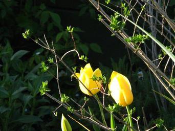 Keywords: Yellow Tulips.jpg en Unidentified yellow tulips against lilac sprigs Own ChickenFreak Unidentified Tulipa cultivars Unidentified Syringa Tulipa in April