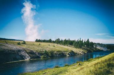 Keywords: yellowstone national park geyser stream water reflections landscape scenic destinations sky clouds forest trees steam nature wyoming outside
