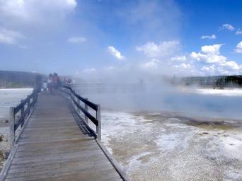 Keywords: yellowstone national park wyoming usa tourist attraction nature minerals water landscape scenery wooden bridge steam hot volcanic