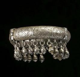 | Keywords: Yemeni - Bracelet - Walters 572318 - View A.jpg The chased bracelet is made of a larger 2/3 and a smaller piece 1/3 that together form a hollow ring which is held together by a clasp The design depicts fourleaf clovers six on the larger piece and three on the smaller piece of the ring The lower rim has twenty-two loops each with a ring - twenty with three-dimensional drop-shaped pendants one with a two dimensional drop-shaped pendant and one with a rosette-shaped pendant The inside of the bracelet has an Arabic stamp with the name of the ruler al-Mahdi The similarity to stamps of al-Mahdi al- Abbas makes it likely that the pendants were produced under his reign from AH 1161-1189 AD 1748-1775 In addition the name of the silversmith is engraved in Hebrew xxx Iraqi The first name is lost but the supplement Iraqi clarifies that he or his family came from originally from Iraq 1161-1189 AH/AD 1748-1775 silver with gilding Outer diam cm 7 ; Inner diam 1 7/8 x W 13/16 in 4 8 x 2 1 cm accession number 57 2318 80922 Mr Benjamin Zucker Zucker Family Trust and Mr Derek Content New York and London by purchase Walters Art Museum Joint gift to the Walters Art Museum Baltimore and the Israel Museum Jerusalem by Mr Benjamin Zucker and Mr Derek Content in honor of Mrs Barbara Zucker and Mrs Amanda Content 2010 Stamp Arabic al-Mahdi Engraving Hebrew xxx 'Iraqi place of origin northern Yemen Walters Art Museum license Jewellery in the Walters Art Museum South Arabian art in the Walters Art Museum Art of Yemen Media contributed by the Walters Art Museum needs category review |