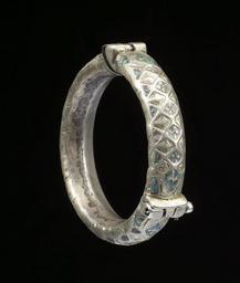 | Keywords: Yemeni - Bracelet - Walters 572324 - View B.jpg The chased bracelet is made of a larger 2/3 and a smaller piece 1/3 that together form a hollow ring The decoration is that of a rhombic pattern with a cross-shaped design inside of the rhombi of the central row The other rhombi are either gilded or filled with green enamel The bracelet is very similar to Walters 57 2320 On the inner side of the bracelet is an Arabic stamp with the name of the ruler and date al-Mansur xxx4 Al-Mansur Ali I ruled from AH 1189 to 1224 AD 1775-1809 1189-1224 AH/AD 1775-1809 silver with gilding green enamel Outer diam cm 7 1 ; Inner diam 2 x W 9/16 in 5 1 x 1 4 cm accession number 57 2324 80928 Mr Benjamin Zucker Zucker Family Trust and Mr Derek Content New York and London by purchase Walters Art Museum Joint gift to the Walters Art Museum Baltimore and the Israel Museum Jerusalem by Mr Benjamin Zucker and Mr Derek Content in honor of Mrs Barbara Zucker and Mrs Amanda Content 2010 Stamp Arabic al-Mansur xxx4 place of origin Taizz Yemen Walters Art Museum license Jewellery in the Walters Art Museum South Arabian art in the Walters Art Museum Art of Yemen Media contributed by the Walters Art Museum needs category review |