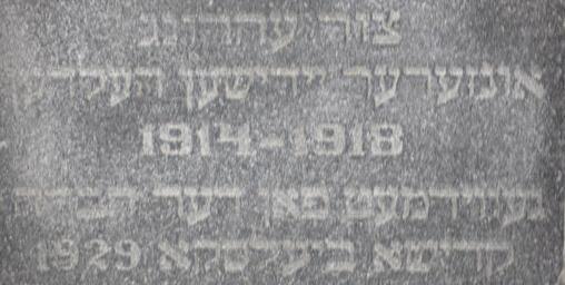 | Keywords: Yiddish inscription on jewish cemetery Bielsko-Biała.jpg en Yiddish inscription on monument of soldiers which died during World War I on jewish cemetery in Bielsko-Biała Poland pl Inskrypcja w języku jidysz na pomniku upamiętniającym żydowskich żołnierzy z czasów I wojny światowej cmentarzu żydowskim w Bielsku-Białej own Gaj777 2009-03-29 49 49 3 9 N 19 1 34 7 E Jewish cemetery in Bielsko-Biała Jewish inscriptions in Poland Jewish inscriptions Yiddish inscriptions | ||||