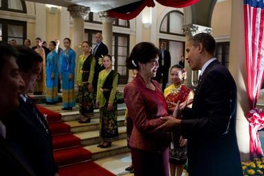 | Keywords: Yingluck Shinawatra and Barack Obama.jpg Barack Obama talks with Thai Prime Minister Yingluck Shinawatra before departing the Government House of Thailand in Bangkok on 18 November 2012 Thai welcome performers line the stairs 2012-11-18 09 34 42 http //www flickr com/photos/whitehouse/8247638915 White House P111812PS-1308 Pete Souza DEFAULTSORT 20121118093442 PD-USGov Barack Obama in Thailand 2012 Photographs by Pete Souza Taken with Canon EOS 5D Mark III Uploaded by O'Dea Uploaded with UploadWizard Yingluck Shinawatra and Barack Obama Government House of Thailand |