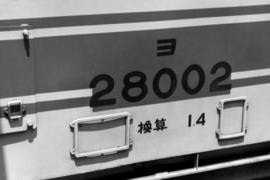 | Keywords: Yo 28002 Car number plate.jpg ja 783系が 電化区間を走行するためじ準備された電源車ヨ28000 en A YO 28000 car number plate The carriage was used for power supply for series 783 train when the train run line without electification 1989-07-30 own Hahifuheho other versions cc-zero JNR Yo 8000 Black and white photographs of trains in Japan 1989 in rail transport in Japan July 1989 photographs Generator cars of Japan | ||||